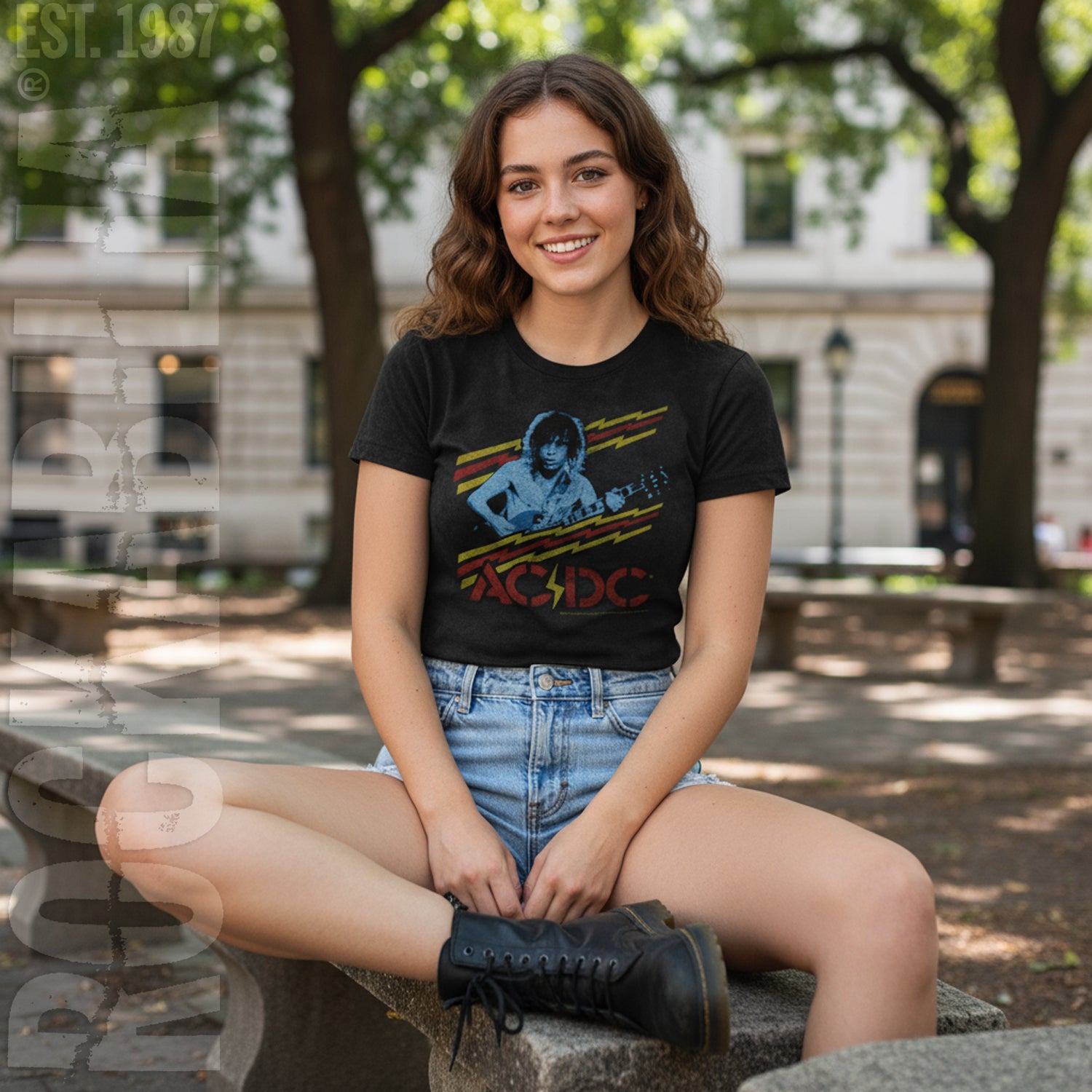 Vintage Distressed Purple Tone Angus Young Playing Guitar Between Red & Yellow Lightning Bolts Logo