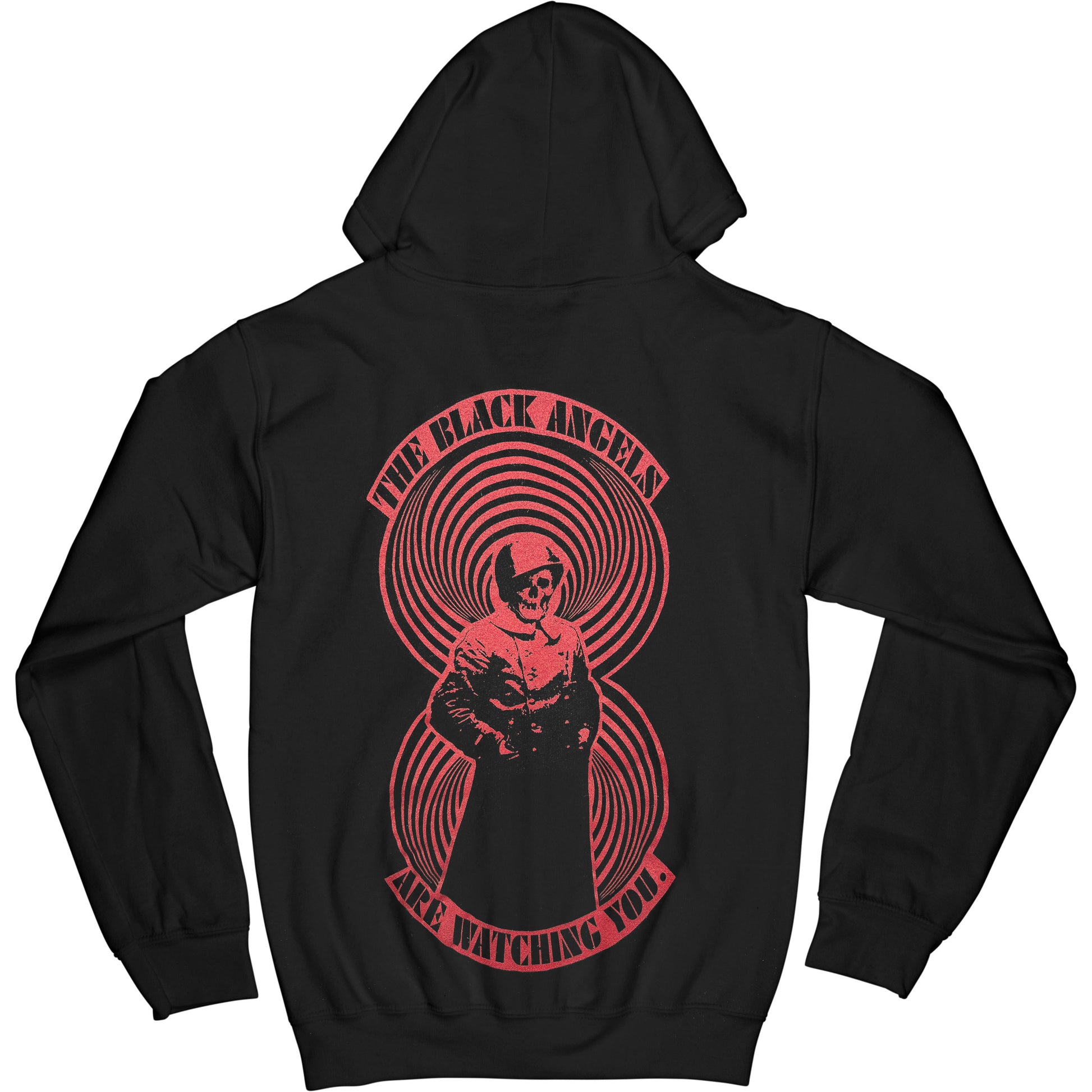 Red & Black Girls' Face Within Circle Pocket Logo/The Black Angels Are Watching You. Logo With Skeleton Lady In Red & Black Warp Circles