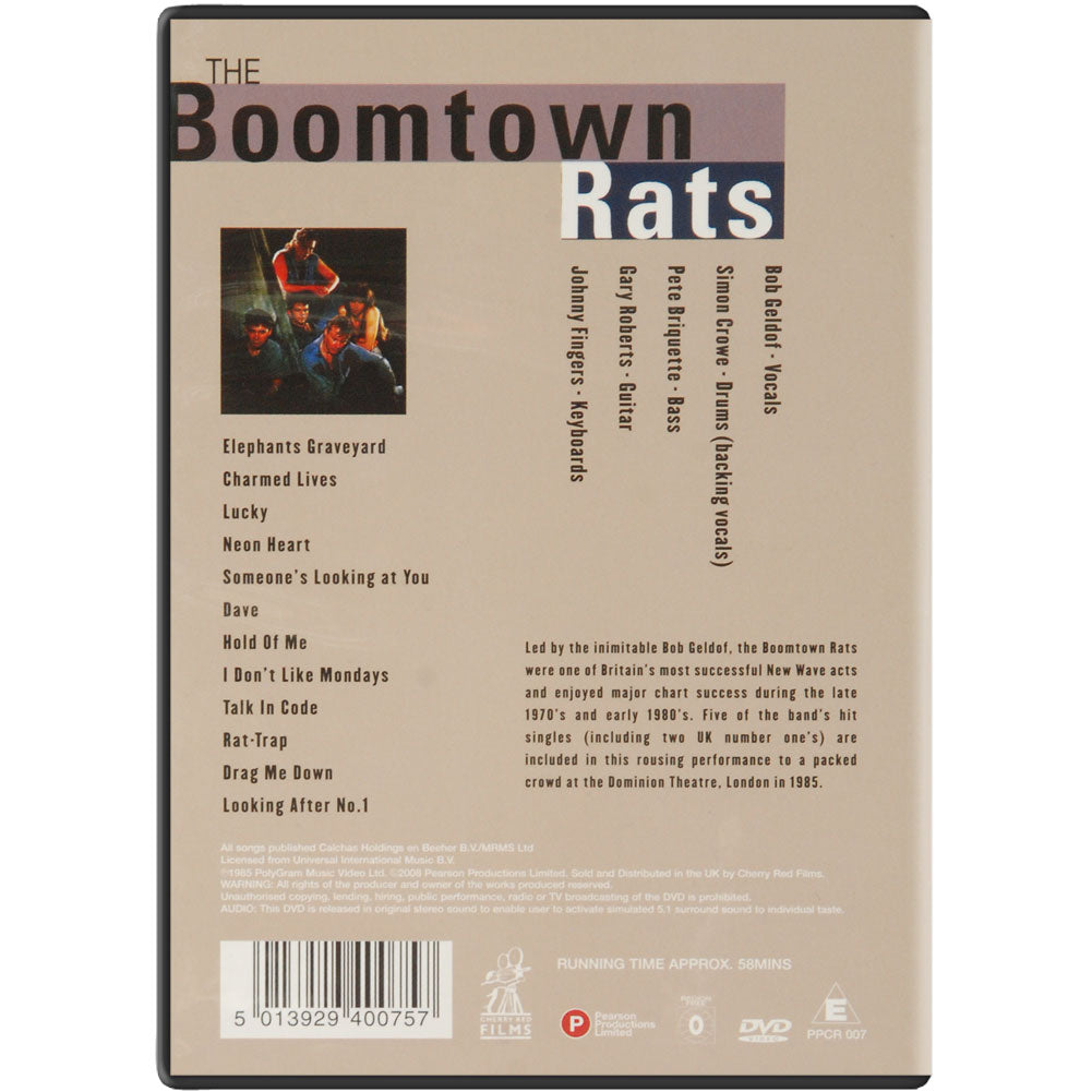 Led by the inimitable Sir Bob Geldof (and totally overshadowed by his later charity work on the Band Aid and Live Aid projects), the Boomtown Rats were nevertheless an important and notable band who were a real force in the charts and active between 1975 and 1986. 5 of the band's Top 40 singles, including 2 Number 1's, are included in this rousing performance to a rammed crowd filmed at The Dominion Theatre, London in 1985.