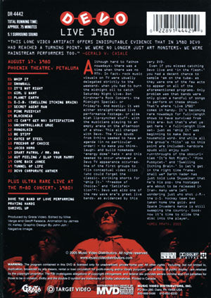 This rare footage has been compiled from a full-length show at the Phoenix Theater in Petaluma, CA in 1980. Songs include Its Not Right, Pink Pussycat, Whip It, Girl U Want, (I Cant Get No) Satisfaction, Swelling Itching Brain and many more. This is DEVO at the peak of their game! Bonus material: Dove - The Band of Love from M80 Concert in 1980, Praying Hands & Shrivel Up.