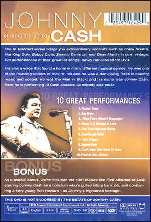 He was the Man in Black, and his name was Johnny Cash. Here he is performing 10 Cash classics as nobody else could. As a special bonus, also included is the 1961 feature film "Five Minutes to Live", starring Cash as a hoodlum who?s pulled into a bank job, and co-starring a very young Ron Howard ? as Johnny?s frightened hostage!