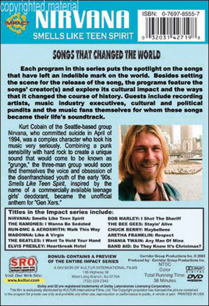 From the Impact Series, Songs That Changed The World - featuring Nirvana: Smells Like Teen Spirit became the unofficial anthem for "Gen Xers." Combining a punk sensibility with hard rock to create a unique sound that would come to be known as "grunge," the three-man group would soon find themselves the voice and obsession of the disenfranchised youth of the early '90s that the media would soon dub "Generation X." The Impact Series contains 12 episodes, with participation by bandmembers, the artists they influenced, journalists, etc. There are performances, videos, memorabilia, etc.
