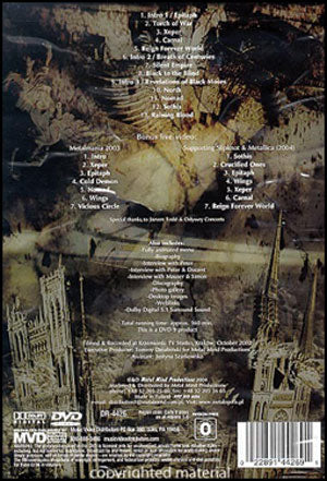 The main show on this DVD, recorded at Krakow TV Studio, is accompanied by two bonus gigs: their performance at Metalmania 2003 and the gig they played supporting Slipknot & Metallica. Track List: Intro1 / Epitaph, Torch of War, Xeper, Carnal, Reign Forever World, Intro 2 / Breath of Centuries, Silent Empire, Black to the Blind, Intro 3 / Revelations of Black Moses, North, Nomad, Sothis, Raining Blood. Bonus video: Metalmania 2003: Intro, Xeper, Epitaph, Cold Demon, Nomad, Wings, Vicious Circle. Supporting Slipknot & Metallica: Sothis, Crucified Ones, Epitaph, Wings, Xeper, Carnal.
